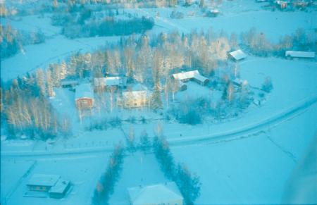 Flygfoto över "Häggbackan", gamla skolan och tidigare oregelbyggeri