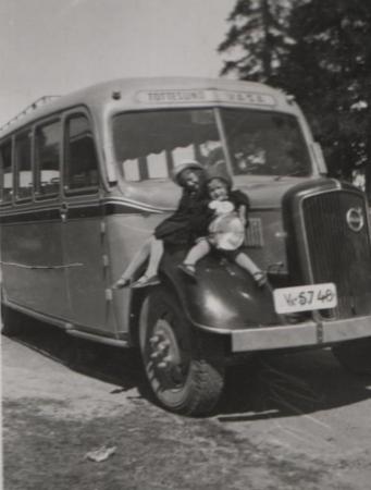 Evert Willförs buss årsmodell 1938. Döttrarna Elisabeth och Maj-Lis Willför poserar framför. Fotot är taget i slutet av 1930-talet.