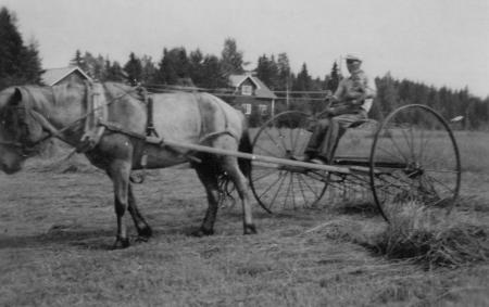Valter och Ole Audas räfsar hö med häst