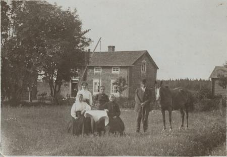 Till höger syns sädesboden och till vänster ”skrapälbåodin” som användes som snickarbod och där fanns också handkvarnen. Foto taget ca 1914-1915.